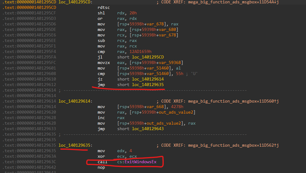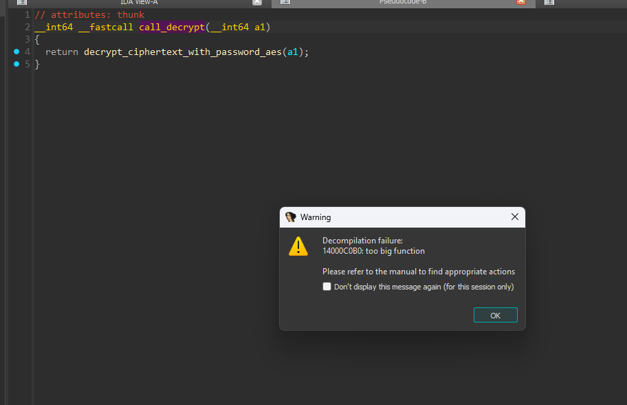 The big, non decompile-able function seem to handle the program logic and isn’t obfuscated in any way, most of it’s bloat is some switch-case (spoilers :D)