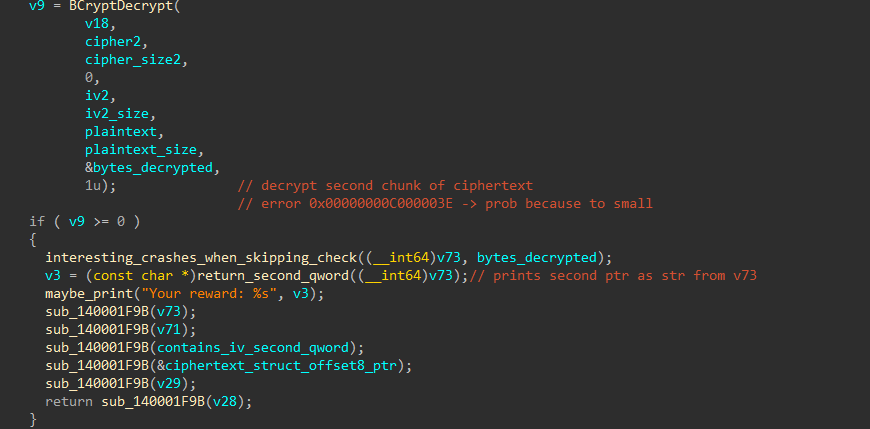 Nice, 2 calls from the same procedure. This makes a lot of sense because usually you call BCryptDecrypt with pbOutput = NULL to get the actual plaintext buffer’s size saved to the outparam to the pcbResult parameter.
