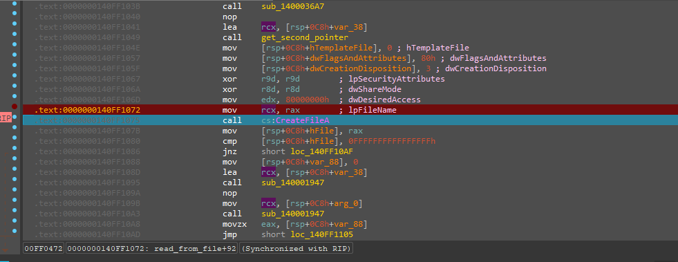 When tracing the xrefs to CreateFileA there are 2 exact copies of the same function, 2 ReadFile functions and 2 WriteFile functions, I’ll break on the ReadFile ones first and check what is the value of second_pointer: