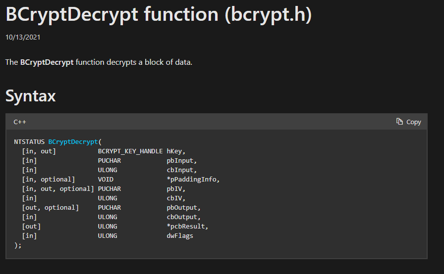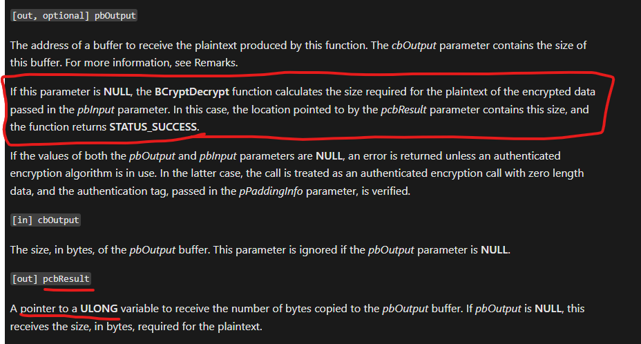 Nice, 2 calls from the same procedure. This makes a lot of sense because usually you call BCryptDecrypt with pbOutput = NULL to get the actual plaintext buffer’s size saved to the outparam to the pcbResult parameter.