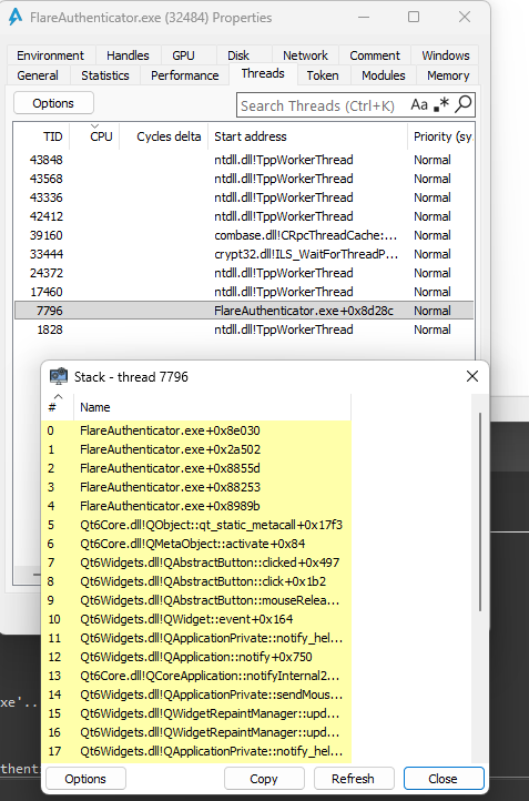 Obviously the challenge right now is get a callback on “OK”, the password checking logic probably happens over there. Having worked with this library before, this is a warning dialog box, so I’ll set a breakpoint on the the calling function to the module