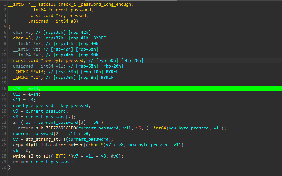 Again, a huge, obfuscated function I called do_program being the “main/game-loop” of our GUI up. It references the plaintext password here (and in a lot of other places) and initializes some sort of struct that it’s offset 0x58 is the plaintext password excluding the current new pressed digit. After this, the function we went over copies onto it and we can continue execution.