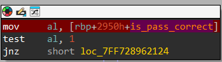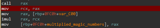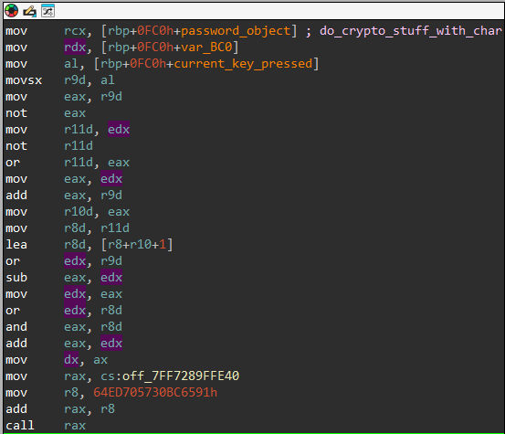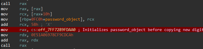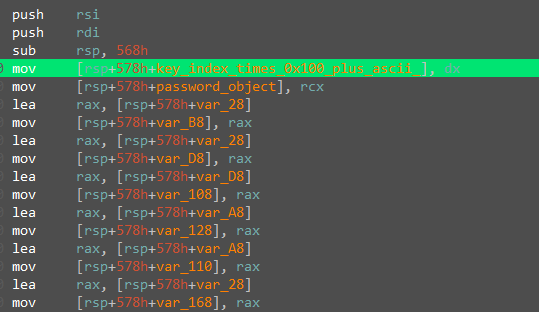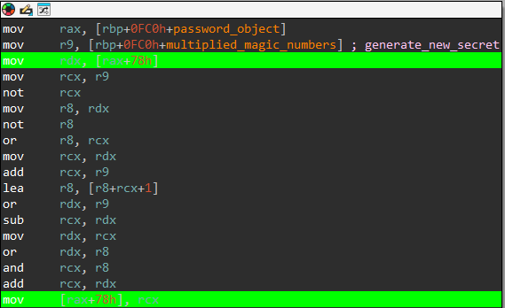 I know IDA’s disable breakpoint green color is horrible to look at but bear with me. The above assembly code takes in the new multiplied hashes and does some binary operations on them and saves the results in *(password_object+0x78), and also look that the previous value of this struct field comes into play. After debugging this I realized this is just a summing snippet, meaning for every digit pressed: