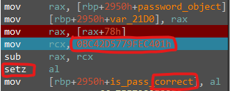Boom! In ok_pressed as expected, there is a comparison to hardcoded number 0xBC42D5779FEC401, now lets go down one xref on is_pass_correct: